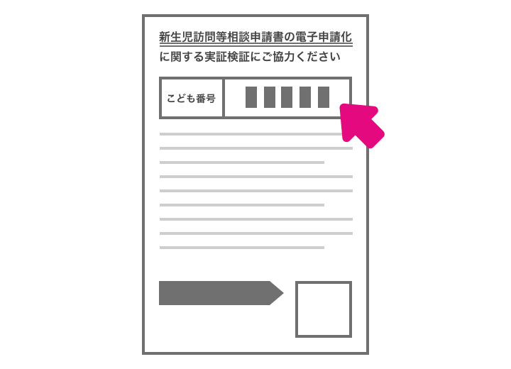 申請書/アンケートを登録するには、『実証協力のお願い』のはがきに記載の『こども番号』が必要です。